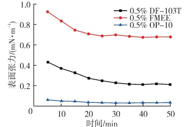 測定0.5%的DF-103T、OP-10、FMEE這3種非離子表麵活性劑的表麵張力,結果見圖2。