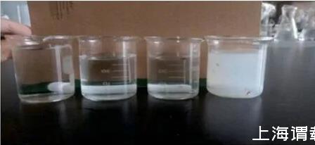 考察不同表麵活性劑(從左至右依次為OP-10、FMEE、DF-103T、AEG050,質量分數皆為0.5%)與模擬地層水的配伍性,結果如圖1所示。由圖1可知:當AEG050與新疆M區油藏模擬地層水混合後有沉澱生成,溶液渾濁,說明AEG050是油溶性的,抗鹽性差,所以當水相的鹽度過高時,在地層水中的溶解性低,不適用於複配體係;而FMEE、DF-103T、OP-10與模擬地層水混合後均無沉澱出現,溶液澄清,說明這3種非離子表麵活性劑的抗鹽性、與地層水的配伍性相對較好。故進一步對其界麵活性進行考察。