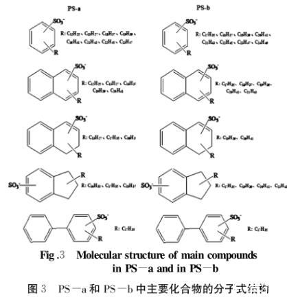 對於PS-b,相對含量較大的20個化合物中,按照相對含量大小依次為:烷基萘磺酸鹽(C17~C21)、烷基苯磺酸鹽(C17~C24)、烷基茚滿磺酸鹽(C17~C21)、烷基四氫萘磺酸鹽(C19~C20);而對於PS-a,按照相對含量大小依次為:烷基苯磺酸鹽(C11~C13、C18~C23)、烷基萘磺酸鹽(C12、C18~C20)、烷基茚滿磺酸鹽(C16~C18)、烷基四氫萘磺酸鹽(C13、C17~C18)。