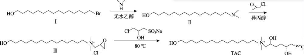 本文擬以15-溴-1-十五醇、二甲胺水溶液、環氧氯丙烷、3-氯-2-羥基丙磺酸鈉為原料,通過季銨化反應和開環反應製備了甜菜堿表麵活性劑(TAC)。通過聚合物和表麵活性劑分子的疏水單元組成的混合膠束與聚合物主鏈發生物理交聯,從而產生擴展的聚合物網絡,以期改善稠化酸的耐溫、耐剪切性能,提高180℃高溫地層的油氣采收率。