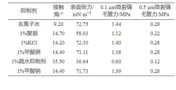 同時從表1中可以看出,疏水抑製劑能夠有效降低溶液的表麵張力,當微裂縫的寬度為0.1μm時,微裂縫對於去離子水的毛管自吸力達到1.44 MPa,而加入疏水抑製劑後可以降低至0.60 MPa,而且隨著微裂縫寬度增加毛管自吸力逐漸降低。納米級別的微裂縫具有較高毛管自吸力,所以在體係構建時應封隔頁岩微納米級裂縫和加入疏水類的處理劑,弱化微納米級裂縫的毛管自吸力。