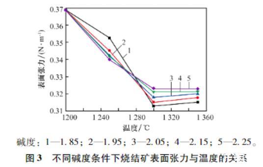 圖3不同堿度條件下燒結礦表麵張力與溫度的關係