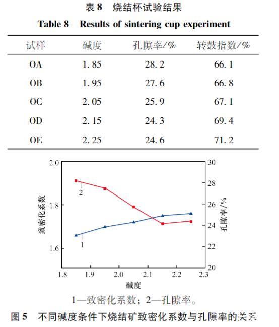 在堿度為1.85~2.25範圍內,燒結試驗表明,致密化係數與實測孔隙率呈現顯著的負相關關係(F_{Den}越大,孔隙率越小)。致密化係數與燒結礦的轉鼓指數(強度)在堿度1.85~2.15範圍內呈正相關(F_{Den}越大,強度越高)。在堿度提高至2.25時,雖然計算F_{Den}繼續增大,但實際燒結礦受高堿度下礦相變化(如矽酸二鈣晶型轉變)影響,孔隙率微升,強度微降,表明優化堿度在2.15附近為佳。