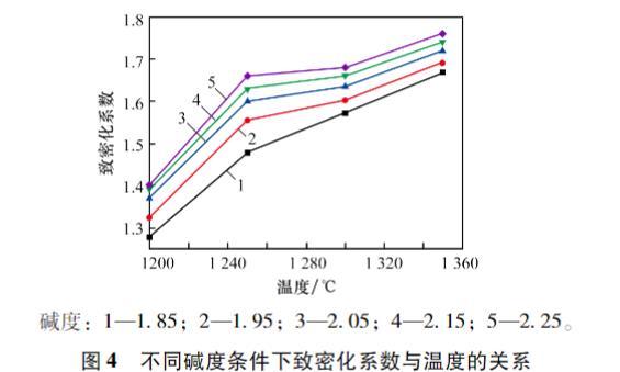 在燒結過程中,熔體表麵張力是主要驅動力,而熔融混合物的表觀黏度是主要阻力。因此,這兩個因素是定量分析燒結過程中聚結行為的關鍵。根據公式(5),並參考文獻[17]中A和E的擬合值(A=1,E=1為簡化表征,實際計算中按該假設進行相對值比較),計算得到了不同堿度及溫度條件下燒結礦的致密化係數F_{Den},結果如圖4所示。