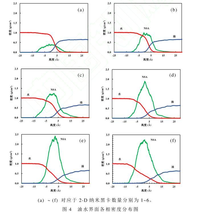 運用所構建的油水界麵模型,研究2-D納米黑卡(NSA)在油水界麵的密度分布及吸附行為,模擬結果如圖4所示。納米黑卡數量增加時,界麵處油相密度變化幅度大。這是由於隨著納米黑卡數量的增加,接枝的直鏈烷烴與油相相互作用不斷增強所致。當體係達到平衡狀態,納米片大部分浸沒在水相中,直鏈烷烴主要浸沒在油相中。此時,納米黑卡所處的平衡位置受到納米黑卡重力和分子間相互作用力的影響很大,分子間相互作用力包括範德華力和靜電力。納米片偏親油性,顯示出與油水分子間的弱範德華力,而直鏈烷烴與油相分子間存在強範德華力,因此納米片被拉向油相。隨著納米黑卡數量的增加,油水界麵納米片的密度隨之增加。納米黑卡的密度在中線附近出現峰值,當納米黑卡數量增至4片後繼續增加黑卡數量,在中線部分納米黑卡的密度增加量並不明顯,隻是高峰變寬了。