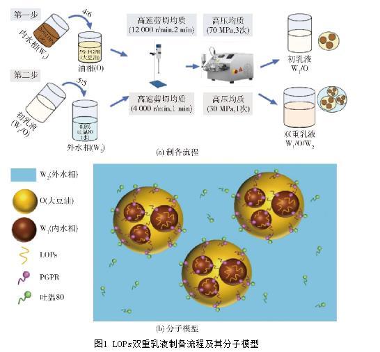 通過兩步法製備雙重乳液,製備流程及分子模型見圖1。操作步驟:將內、外水相及油相攪拌15 min,混勻後於4℃避光貯藏12 h備用;第一步,將質量分數為20%的LOPs水溶液作內水相,內水相與油相的質量比為4∶6。將內水相加入含有PGPR(質量分數為5%)的大豆油中,先經高速剪切機(12 000 r/min,2 min)混合後,再經高壓均質機在70 MPa條件下循環3次,獲得W1/O初乳液。第二步,將質量分數為0.8%的吐溫80水溶液作外水相,W1/O乳液與外水相的質量比為5∶5。將W1/O乳液加入外水相後,再用高速剪切機(4 000 r/min,1 min)混合,並經高壓均質機在30 MPa的條件下均質1次,獲得LOPs的W1/O/W2型雙重乳液,於4℃條件下存儲。