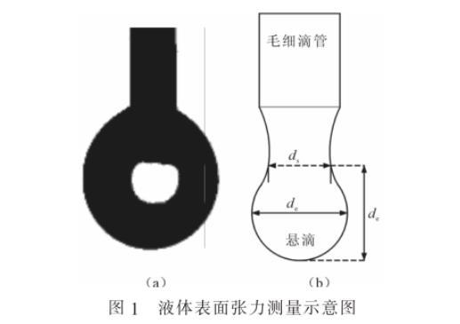 筆者采用液體表麵張力的測量方法為懸滴法,即通過測量懸掛著的液滴的外形參數而推算出液體表麵張力,如圖1所示。在憎水角測試儀配套的微量進樣器中滴出液滴,拍攝液滴照片,讀取液滴形態參數的像素值,根據測量滴管的實際尺寸和像素值,獲得像素值和實際尺寸的比例,換算實際液滴的尺寸參數,並根據公式推算表麵張力。