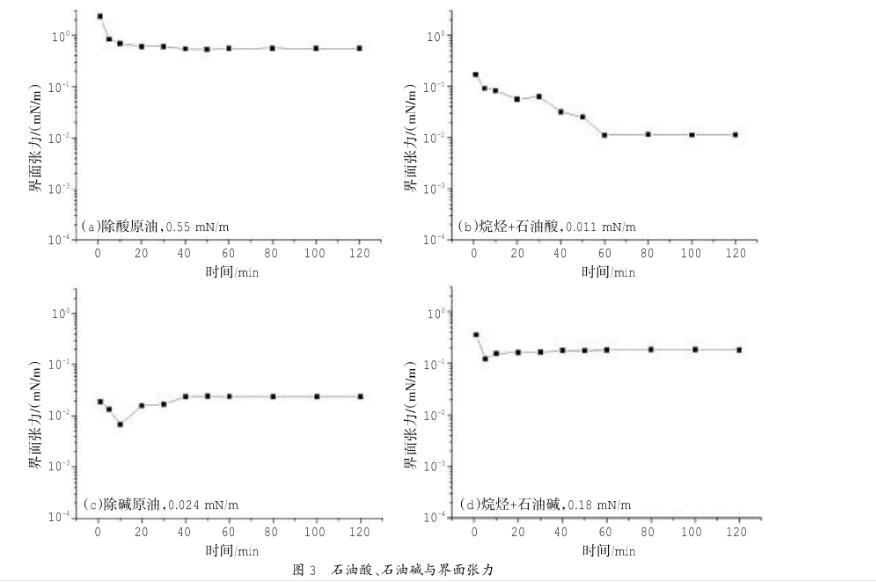為研究遼河石油酸、石油堿與界麵活性之間的關係,首先測量了遼河兩性表麵活性劑與原油之間的界麵張力,為0.005 2 mN/m,可以超低;也測量了表麵活性劑與烷烴之間的界麵張力,為1.38 mN/m,界麵活性較差;在此基礎上考察石油酸、石油堿對降低界麵張力的貢獻。由圖3可以看出,在原油剔除石油酸組分後,界麵張力由超低陡然升高至0.55 mN/m,說明石油酸組分對超低界麵張力的形成具有非常重要的作用,也說明在遼河油田的兩性表麵活性劑二元複合驅中,石油酸組分依然發揮著原油活性物質的作用;在烷烴組分添加石油酸後,界麵張力由1.38 mN/m降低至0.011 mN/m,兩個數量級的降低,進一步說明石油酸組分與遼河兩性表麵活性劑之間具有明顯的相互作用,是有效降低界麵張力的重要原油組分。