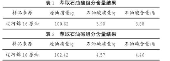 由表1、表2可以看出,遼河原油中萃出石油酸組分的含量為3.88%,萃出石油堿組分的含量為4.46%,石油堿略高於石油酸。