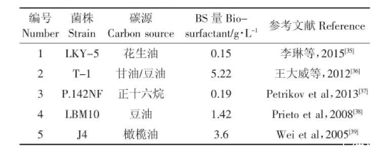 最佳培養條件下,本實驗細菌生物量最高能達到5.22 g·L-1(表6),生物表麵活性劑量達到5.09 g·L-1。相對已報道的幾株銅綠假單胞菌(Pseudomonas aeruginosa)合成生物表麵活性劑的產率在2.12~15.92 g·L-1範圍內,本菌株的產表麵活性劑能力居中。