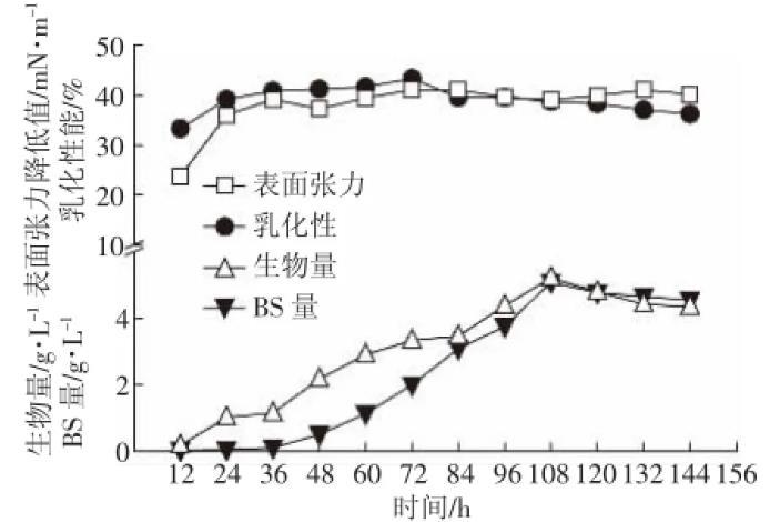 在上述花生油25 mL·L-1為碳源、硫酸銨1 g·L-1為氮源、NaCl濃度為5 g·L-1、pH=8、溫度保持為30℃的最佳培養條件下,追蹤細菌147的發酵動態(圖7)。菌株經過短暫的延滯期後進入對數生長期,108 h後進入穩定增長期,此時菌體所產生的生物表麵活性劑含量達到最大,此後生物表麵活性劑含量減少,可能是因為後期培養基內的碳源已經用盡,細菌開始以胞外分泌物糖脂為碳源維持生命。而表麵張力值與乳化性在24 h後達到最大,之後維持在穩定水平,說明細菌在24 h後產生的生物表麵活性劑已到達生物表麵活性劑的臨界膠束濃度,此後生物表麵活性劑產量還會增加,但是表麵張力降低值與乳化性隻維持在一定範圍內波動。