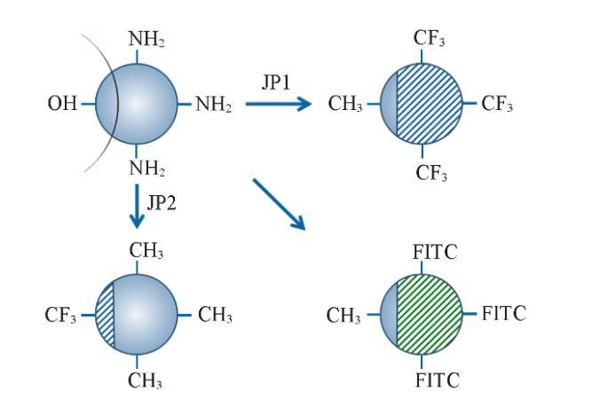 將具有APS和OTS的SiO₂顆粒分散在2.4×10⁻² mol/L PFOA的甲苯溶液中並攪拌48 h。通過蒸發除去溶劑,再多次離心洗滌,然後在110℃下退火2 h,將所製得的顆粒命名為JP1,製備過程如Scheme 1所示。