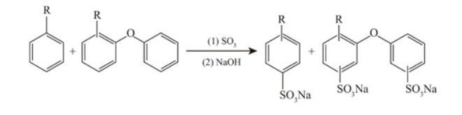采用SO3膜式磺化工藝,改變烷基二苯醚與烷基苯的質量比,將二者混合進行磺化反應,然後用NaOH溶液中和,製得質量分數為25%的烷基二苯醚/烷基苯混合磺酸鹽,反應方程式如下: