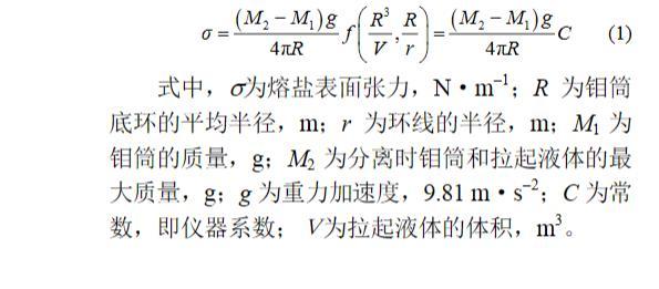 式中,σ為熔鹽表麵張力,N·m−1;R為鉬筒底環的平均半徑,m;r為環線的半徑,m;M1為鉬筒的質量,g;M2為分離時鉬筒和拉起液體的最大質量,g;g為重力加速度,9.81 m·s−2;C為常數,即儀器係數;V為拉起液體的體積,m3。