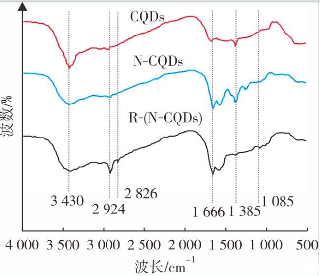 圖2是CQDs、N-CQDs與R-(N-CQDs)的紅外吸收光譜,在3 430 cm-1處的吸收峰是O-H和N-H伸縮振動,相比於N-CQDs,R-(N-CQDs)在此處的吸收峰較弱,說明在N-CQDs基礎上發生了一定程度的烷基化反應,而CQDs在此處的峰比N-CQDs與R-(N-CQDs)的峰要窄,因為CQDs上隻存在O-H的伸縮振動,在2 924 cm-1和2 824 cm-1處的吸收峰是C-H的伸縮振動,R-(N-CQDs)在此處的吸收峰比N-CQDs的要強。1 660 cm-1處的吸收峰對應於酰胺基團C=O鍵的拉伸振動,1 385 cm-1處的峰為C-O伸縮振動,1 085 cm-1處的峰為胺類烷基的C-N振動,R-(N-CQDs)在此處的峰較N-CQDs更為明顯,而CQDs在此處看不到任何吸收峰,進一步說明在R-(N-CQDs)在N-CQDs的基礎上完成烷基化改性成功引入碳長鏈。圖2表明實現了將氮原子摻雜到碳量子點中的目標,並且在此基礎上引入了碳長鏈對其進行表麵修飾。