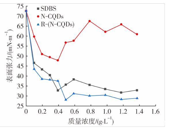 圖6 SDBS、N-CQDs及R-(N-CQDs)表麵張力與質量濃度的關係