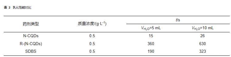 從表2可看出,R-(N-CQDs)的乳化性能遠優於SDBS,分離出5 mL和10 mL水的時間接近SDBS的兩倍。這是由於R-(N-CQDs)是納米顆粒,吸附在界麵膜附近可以大大增強界麵膜的強度,從而增強了乳狀液的穩定性。