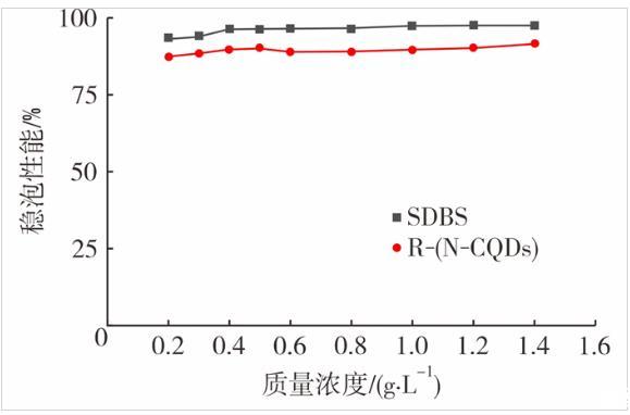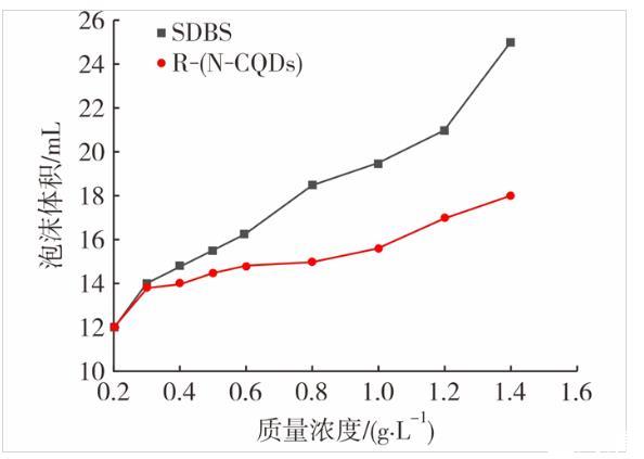 從圖7可看出,R-(N-CQDs)的起泡能力表現不佳,雖然在高質量濃度下其起泡能力相比低質量濃度時有一定的提高,但是相對於SDBS的起泡能力仍存在較大的差距,這與R-(N-CQDs)自身結構有關,SDBS是直鏈結構,而R-(N-CQDs)結構上存在很多支鏈,形成泡沫時需要克服更多的表麵能做功,所以形成的泡沫比SDBS更少。