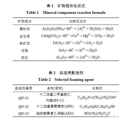 圖1為2口低產井采集樣品的X射線衍射結果。可以看出,2種無機礦物樣品中矽酸鹽岩成分占比大,因此選用乙酸、鹽酸、氫氟酸3種常規酸液進行無機礦物溶蝕試驗,理想狀態下礦物組分被單一酸液的侵蝕過程見表1。選用的3種常見起泡劑分別為:十二烷基二甲基胺乙內酯(BS-12)、十二烷基葡萄糖苷(APG)、脂肪醇聚氧乙烯醚(AEO),見表2。其中BS-12為兩性離子型起泡劑、APG為陰−非離子型起泡劑、AEO為非離子型起泡劑。