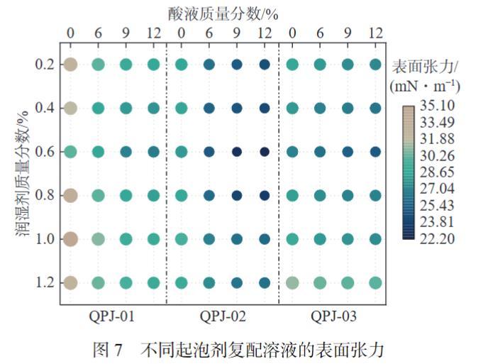 氣液界麵表麵張力一定程度上表征起泡性能,溶液氣液表麵張力越小,分子間束縛力下降,氣泡更容易溢出,起泡性能更強。因此為了測定混合酸環境下不同起泡劑複配溶液起泡效果,選用設備為SDC-350整體傾斜型接觸角測量儀開展表麵張力測試試驗。圖7為QPJ-01、QPJ-02、QPJ-03等3種不同濃度起泡劑在清水與不同濃度酸液條件下的氣液界麵表麵張力,由圖7可知,3種起泡劑−酸液複配溶液表麵張力與起泡劑−清水溶液相比,均呈降低狀態,溶液含酸較清水會顯著降低氣液界麵表麵張力,含酸率越高,表麵張力越小,在一定程度上溶液酸度對起泡性能起促進作用。在相同起泡劑複配酸液溶液內,酸液濃度越大,氣液界麵表麵張力減少越緩慢,酸液越稀,表麵張力下降越快。
