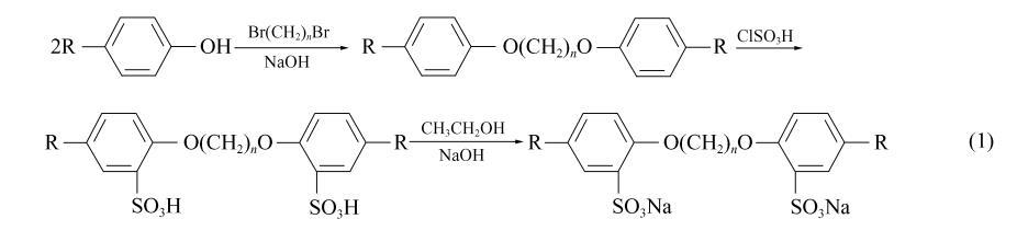 式(1)中,疏水基 R基團為 (CH3)3CCH2C(CH3)2 ;聯結基為 -O(CH2)nO-n 為2,4,6,8。所得產物記為 D2Cn 係列。