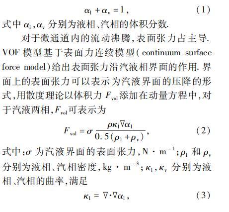添加表麵活性劑的水溶液濃度較低,除表麵張力、黏性和潤濕特性的改變外,其物性參數可參照純水選取。考慮表麵張力在微通道內流動沸騰的主導作用,暫未考慮水溶液黏性、潤濕特性對流動沸騰的影響,僅考慮表麵張力的作用。根據水、水蒸汽的相關數據計算可得:汽液兩相的Knudsen數(Kn)均遠小於0.001,N-S方程仍然適用於汽液兩相。控製方程中的對流項、擴散項采用2階迎風格式,壓力速度耦合選則PISO算法,壓力項離散選用PRESTO格式。
