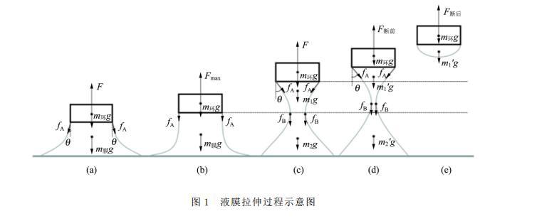 此時的液膜m1′將停留在吊環上,如圖1(e)所示。所以拉斷後,吊環所受拉力為吊環重力與殘留液膜重力之和。