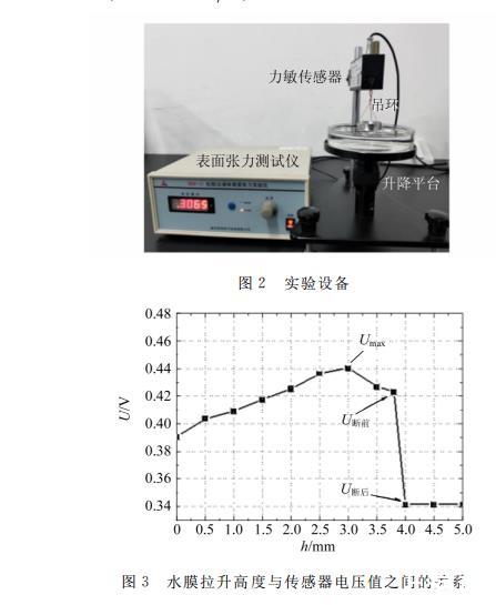 圖2是WBM-1A拉脫法液體表麵張力實驗儀,用來測定純淨水的表麵張力係數。實驗時采用標準吊環的內、外徑分別為d1=33.10 mm,d2=34.96 mm,平均直徑為d̄=34.03 mm,平均周長為πd̄=106.88 mm。該標準環拉出的水膜高度與力敏傳感器電壓讀數之間的關係,如圖3所示。可以看出,隨著水膜高度的增加,吊環拉力逐漸增加到最大(圖中Umax表示),然後慢慢減小,直至水膜斷裂。圖中U斷前和U斷後分別表示水膜斷裂時和斷裂後的瞬時電壓值。吊環的受力變化情況與之前理論分析一致。