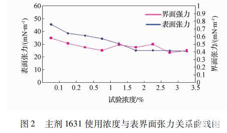 圖2 主劑1631使用濃度與表界麵張力關係曲線圖