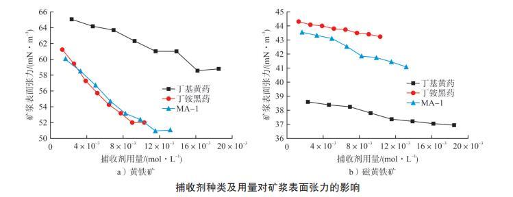 為研究捕收劑種類及用量對礦漿表麵張力的影響,將黃鐵礦與磁黃鐵礦配成 30%濃度的礦漿,起泡劑2號油用量3×10⁻⁵ mol/L、粒度-0.074 mm占比80%、pH=7,改變捕收劑種類及用量以測定礦漿表麵張力。