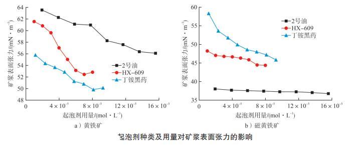 結果發現:隨著起泡劑用量的增加,黃鐵礦與磁黃鐵礦的表麵張力均整體呈下降趨勢。對於黃鐵礦礦漿表麵張力的影響,2號油>HX-609>丁銨黑藥,HX-609的表麵張力雖然不是最低,但 HX-609達到最低礦漿表麵張力所用藥劑用量最少,可以明顯降低藥劑使用成本。對於磁黃鐵礦礦漿表麵張力的影響,丁銨黑藥>HX-609>2號油,且三者差值較大,2號油用量為3×10⁻⁵ mol/L時可顯著降低礦漿表麵張力。
