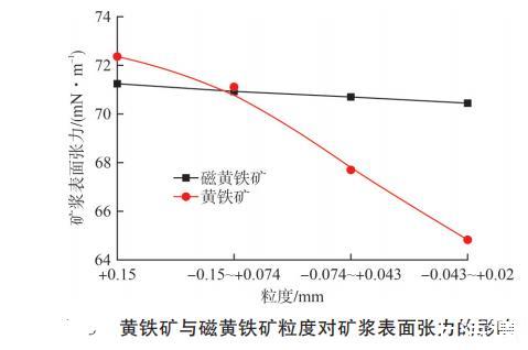 結果發現:粒度越細,礦漿表麵張力越小。隨著粒度從+0.15 mm降低至-0.043~+0.02 mm,黃鐵礦礦漿表麵張力下降較為明顯,從 72.35 mN/m降低至 64.83 mN/m;磁黃鐵礦礦漿表麵張力下降幅度較小,礦漿表麵張力從71.24 mN/m降低至70.46 mN/m。