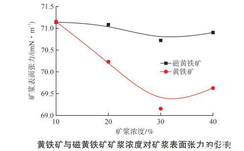 結果發現:礦漿濃度從 10%增加至 30%,黃鐵礦礦漿表麵張力從 71.15 mN/m降低至 69.15 mN/m;礦漿濃度繼續增加,礦漿表麵張力反而升高,直至 69.63 mN/m。隨著礦漿濃度持續增加至 30%,磁黃鐵礦礦漿表麵張力從71.14 mN/m降低至 70.72 mN/m;當礦漿濃度超過30%,礦漿表麵張力有所增加,礦漿濃度增加至40%,礦漿表麵張力達到70.90 mN/m。